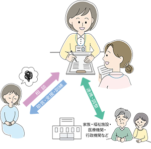 受診や入院に伴う患者や家族の悩みを受け止めながら、医師の診療に必要な情報を聞き出します。また、困りごとを聞き、支援する役割を担います。退院支援では、家族や施設の受け入れを調整し、復学や復職、住む場所の確保などの解決策を探っていきます。
